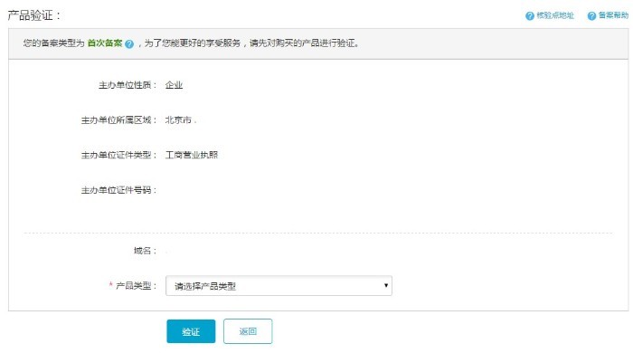 根據填寫的備案域名等信息判斷此次備案為首次備案,繼續填寫產品信息驗證產品